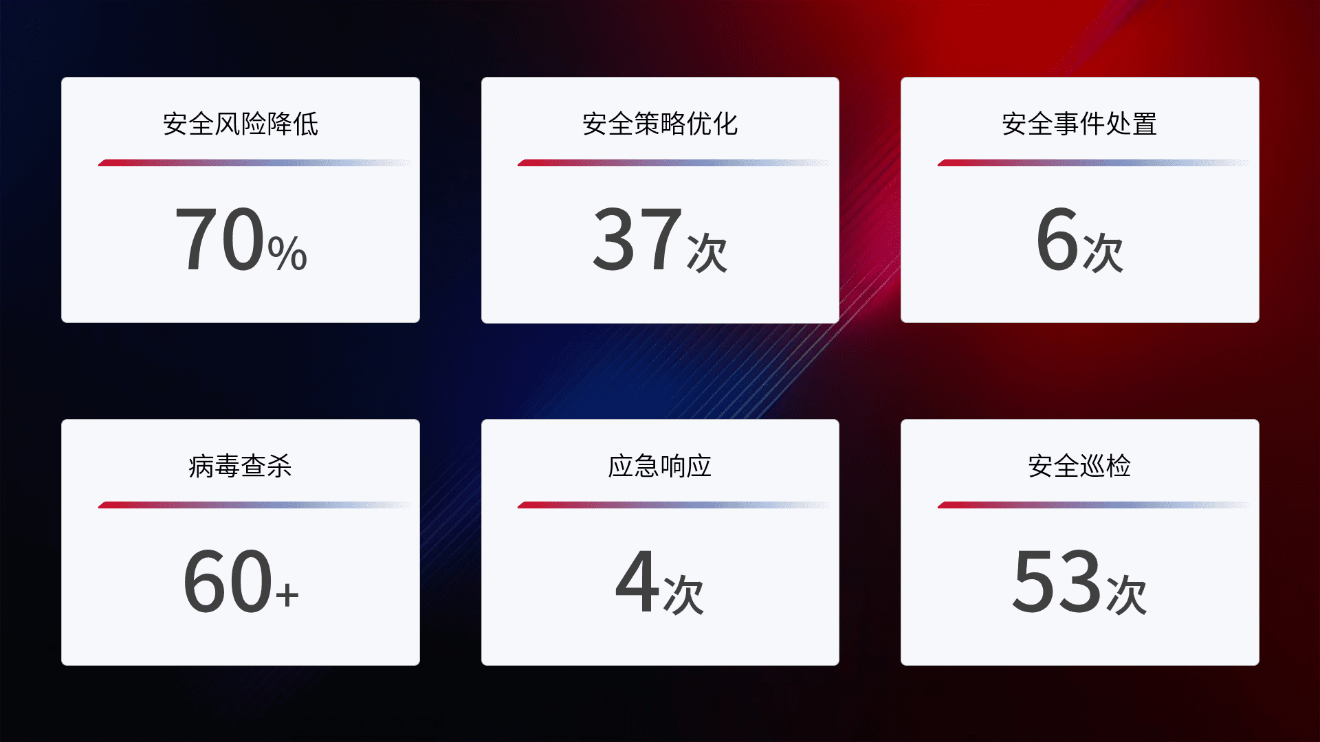 提供全面的安全事件报告体系,,,包括处置报告、、周报、、、季度和年度总结,,,结合持续监控,,,,帮助客户深入了解网络安全状况。。。。